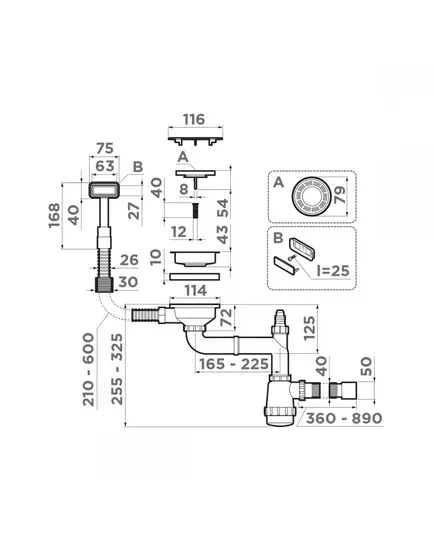 - Арматура для одночашевых моек с прямоугольным переливом, декоративной решеткой и декоративной накладкой.