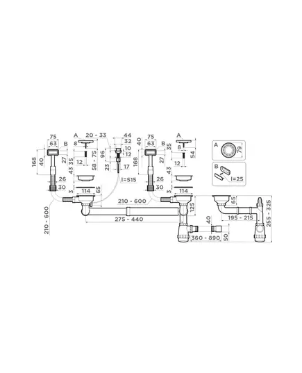• Арматура для двухчашевых моек с прямоугольными переливами, декоративными решетками и клапаном-автомат.