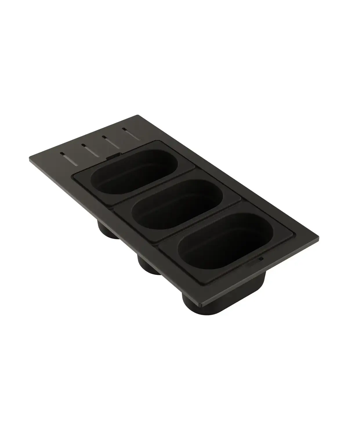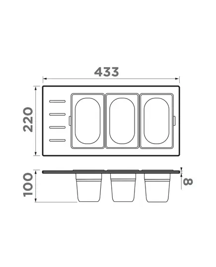 - Чаши свободно вынимаются из пластиковой подставки и перемещаются, а конструкция подставки разработана таким образом, чтобы ее можно было удобно разместить на внутренних ступенчатых направляющих моек: Sintesi 86, Sintesi 100 и Sintesi 116.
