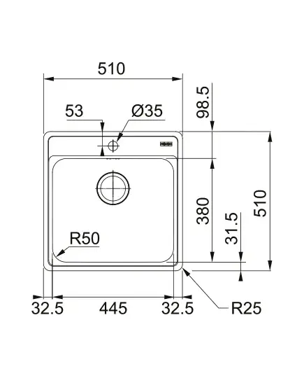 БрендFranke МатериалНержавеющая сталь Размер мойки,мм510х510 Размер чаши,мм445х380 Размер монтажной тумбы,см60 см
