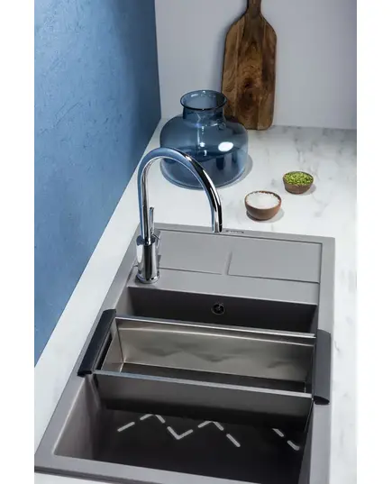 - Благодаря этому элементу мойка обретает устойчивость к воздействию различных кислот и щелочей, что гарантирует ее неизменный внешний вид.