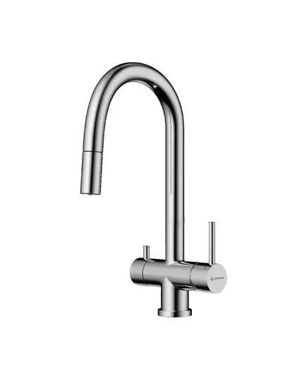 - Вытяжной шланг обеспечивает удобство использования смесителя, которое заключается в возможности мытья труднодоступных мест и бережной очистке мелких столовых приборов.