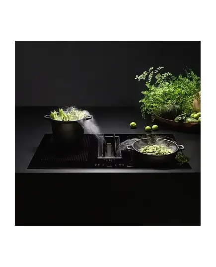 Дизайн: Варочная панель FALMEC Quantum PRO Easy — встраиваемая модель с вытяжкой. Черная стальная рама вытяжной зоны с системой защиты поверхности от царапин расположена между двумя варочными полями с функцией Bridge. Поверхность изготовлена из закаленного стекла Schott, ее можно установить сверху или заподлицо со столешницей.