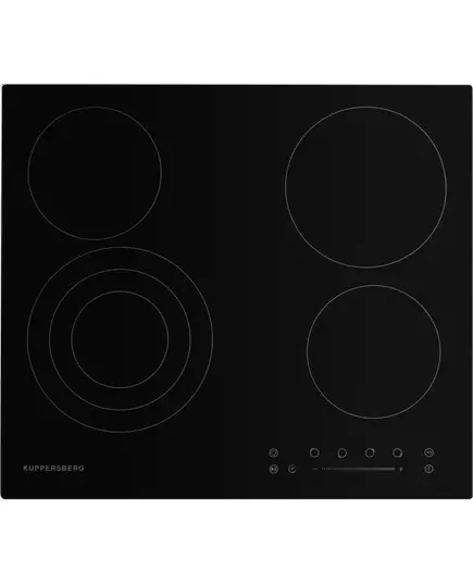 Электрическая варочная панель Kuppersberg ECS 603 относится к типу hi-light. Выпущена она шириной 60 см, что идеально для большей части встраиваемой техники. На плите расположено 4 конфорки разной мощности, что позволяет готовить сразу несколько блюд, а также использовать разнообразные техники обработки: от бережного растапливания до интенсивного обжаривания при высокой температуре. Левая ближняя зона приготовления называется трёхконтурной, поскольку у неё три зоны расширения. При необходимости, пользователь может задать сразу три. Тогда нагрев будет быстрым и равномерным.