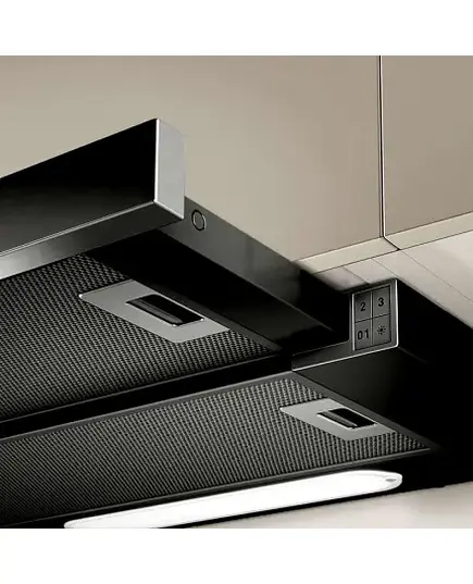 Функционал. Прибор включается путем выдвижения передней панели. Простые кнопочные переключатели гарантируют удобное управление тремя скоростями вытяжки и включением/выключением освещения. Алюминиевый фильтр пригоден для мытья в посудомоечной машине. Модель может работать в режимах отвода и рециркуляции (угольный фильтр для работы в режиме рециркуляции должен быть приобретен отдельно). Две яркие галогенные лампы станут полноценным источником освещения рабочей поверхности.