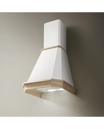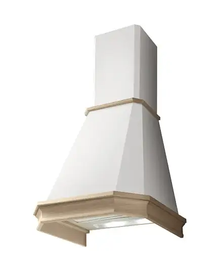 Кухонная техника выполнена в светлом дизайне — она представлена в корпусе белого цвета и дополнена рамкой из неокрашенного натурального дерева. Своеобразный дизайн позволяет вам установить вытяжку в кухонный интерьер любого стиля. Кроме этого, она удобна своими небольшими габаритами: высота — 59,5-96 см, ширина — 59,8 см, глубина — 50,1 см.