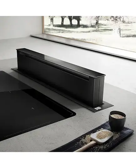 Дизайн. Встраиваемая вытяжка ELICA PANDORA BL/F/90 интегрируется в столешницу, благодаря чему поглощает загрязненный воздух и запахи от приготовления пищи почти мгновенно. Практически незаметная изящная панель черного цвета легко впишется в современный интерьер.