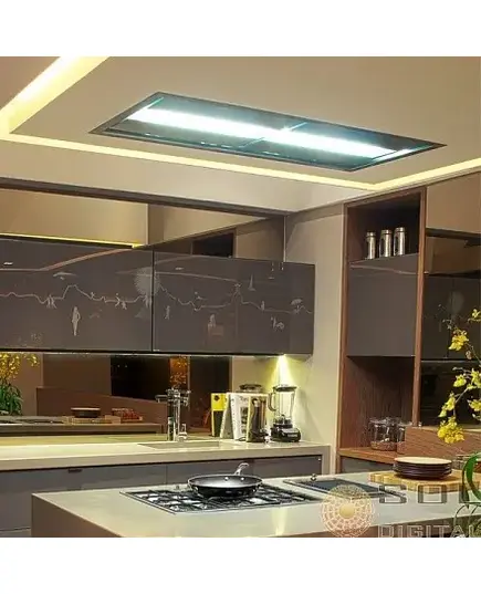 Дизайн. Вытяжка Falmec NUVOLA soffitto 140 inox производится из высокосортной нержавеющей стали марки AISI 304. Фронтальная панель декорирована вставкой из прозрачного закаленного стекла. Модель поставляется без мотора. Неоновое освещение служит хорошей заменой привычным светодиодам.