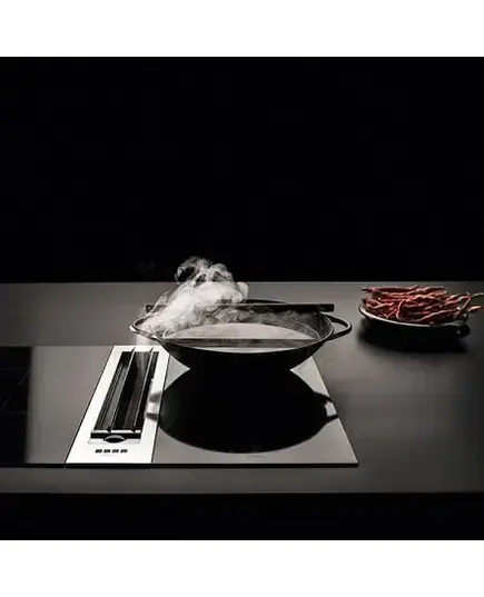 Встраиваемый в столешницу тип монтажа делает инженерное решение модели инновационным. Захват воздуха в непосредственной близости от основного источника нежелательных примесей является уникальным конструкционным ходом. Следует обратить внимание, что её использование рекомендовано только для дополнения электрических варочных панелей. Двигатель мощностью в 1000 м³/ч поставляется отдельно.