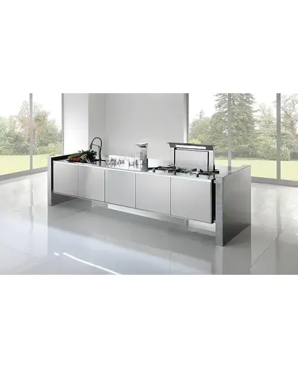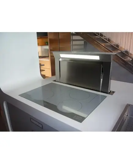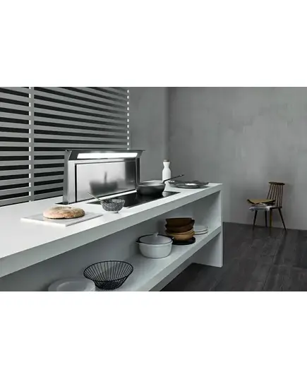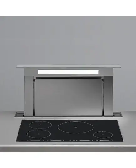 Дизайн. Вытяжка Falmec DOWN DRAFT tavolo 90 IX производится из нержавеющей стали. Модель предназначена для встраивания в столешницу. В выключенном состоянии прибор выглядит как металлическая полоса позади варочной поверхности. Светодиодная лампа видна только при работе устройства.